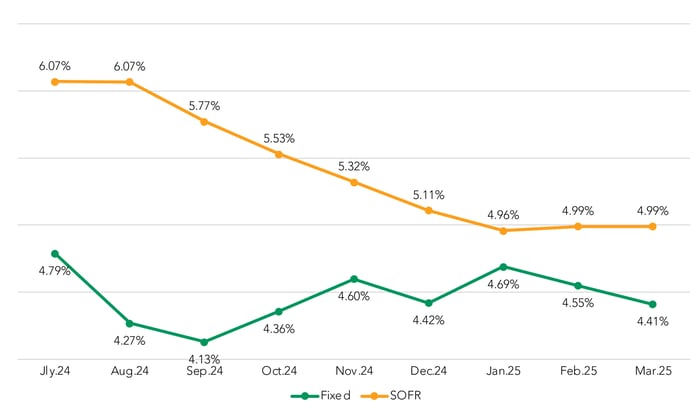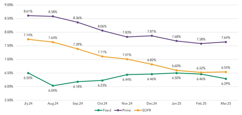 The 3 bps drop in the spread between the fixed-rate coupon and COF was actually the largest shift in the category. Both Prime and SOFR spreads increased by 1 bps in March.