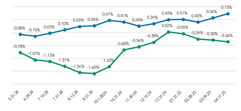 As a result of the trough shift, we looked at the usual 1- to 60-month carry and compared it to the carry from 24 to 120 months. The 1 to 60-month metric (the green line in the chart below) continues to show inversion (-0.36%) which has actually increased in 2025, going from +0.02% at the Dec. 31, 2024 snapshot and inverting each month down to its current point. But the positive carry from 24 to 120 months paints the portrait of a traditional yield curve at 0.73% (the blue line in the chart below) and has steeped by ~24 bps since year end 2024.
