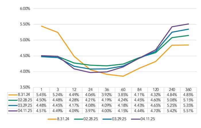 The trough on the FHLB curve, our proxy for the market yield curve, has undergone a shift in recent months. Where once the bottom could clearly be found at the 60-month mark, it has now moved left, toward the 24-month point. This shift may reveal borrower pricing preference toward shorter maturity fixed-rate loans. So far, we have not seen a material shift in fixed rate loan maturities: They averaged 72 months in 1Q25 compared to 71 months in 4Q24. We will continue to monitor this data point for shifts.