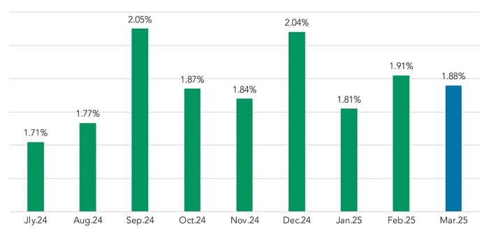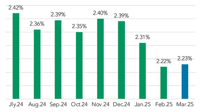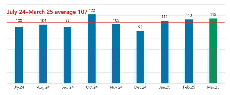 Returning to our examination of current pricing activity, volume continued its upward trend in 2025, with March levels the highest so far this year, as well as the highest mark since October 2024.