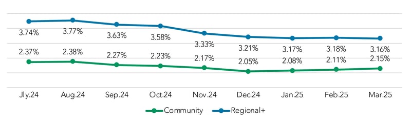 In Q1, deposit rates have dropped 5 bps at regional+ instituions while increasing by 7 bps in the community segment.