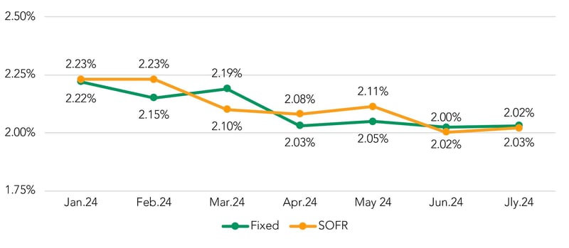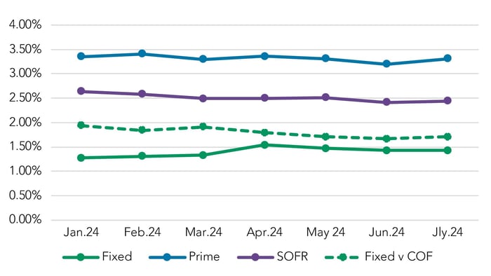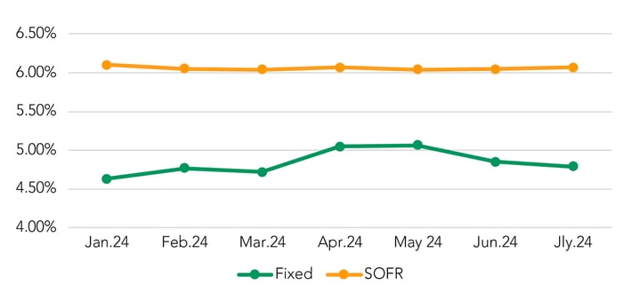 We looked again at SOFR equivalent spreads by structure type. After drops across the board in June, spreads were for the most part static in July — with a slight uptick for spreads on Prime-based floating loans.