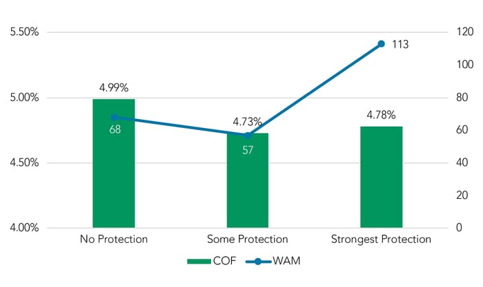 We looked at how FIs were setting funding costs on these loans and the weighted average maturity (WAM) of the loans, in months. We found that overall FIs were incentivizing their bankers to include prepayment protection by dropping the COF on these loans by approximately 25 bps if some level of protection was indicated. We also found that bankers were using the strongest level of protection (typically “make whole” or “Yield Maintenance”) on longer-term loans — with the most risk — with a WAM of 113 for this group. We will continue to monitor this data point in the coming months.