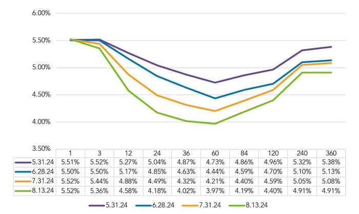 While the drop is notable — 76 bps at the 60-month mark from the May 31 snapshot to an Aug 13 snapshot — we also wanted to call out that the curve’s trough is widening. The curve has also dropped 69 bps at the 12-month mark, 86 basis points at the 24-month mark, and 85 basis points at the 36-month mark. Meanwhile, the 1-month mark — a proxy for floating rates — continues to remain around 5.50%.