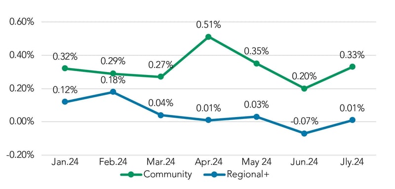 - We define Regional+ as institutions with $8B+ in assets, while Community are <$8B.