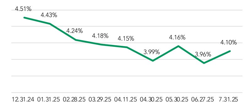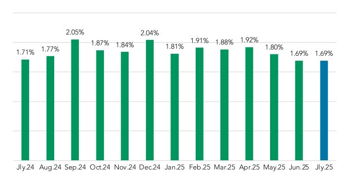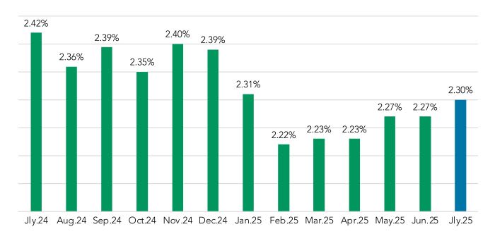 Funding costs for fixed-rate structures reflect the increase in market rates, with an 11 bps rise in July. Floating-rate COF maintained the same flat line trajectory it has held throughout Q2 2025.