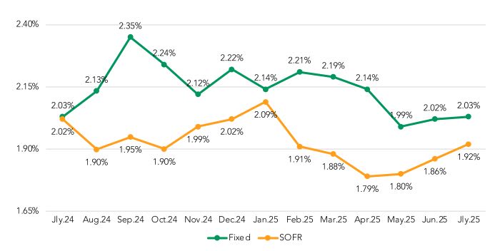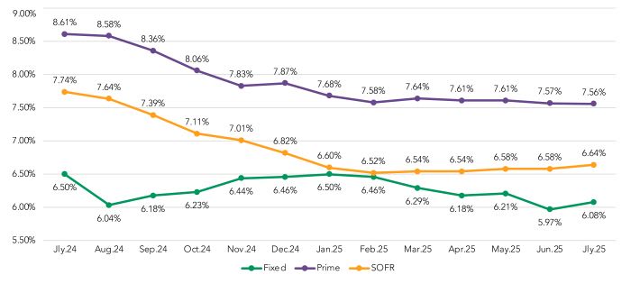 July gave us little of note to report for spreads. SOFR-based spreads experienced a modest increase of 3 bps while Prime-based spreads saw a slight decrease of 2 bps to 6 bps .