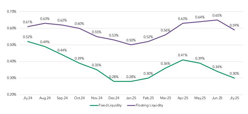 Both fixed- and floating-rate liquidity costs were down slightly in July, with floating liquidity down 6 bps (from 0.65% to 0.59%) and fixed liquidity down 4 bps (from 0.34% to 0.30%). This is the third straight month that fixed liquidity costs have fallen after increasing steadily from January to April.