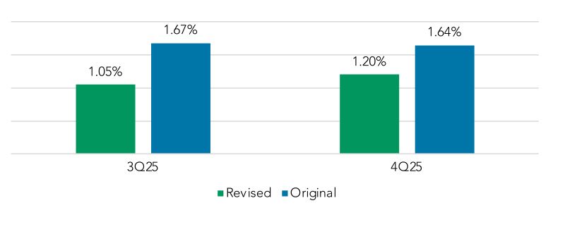 As part of our continued examination of how bankers are handing the repricing of fixed-rate loans from the COVID era, we noted a significant shift in the implied rate shock for these loans. Initial estimates, forecasted at the start of 2025, anticipated an increase of about 1.67% for Q3 2025. But current recalibrations reflect reduced funding costs, which has moderated this implied rate shock to about 1.05%. That could ease repricing conditions for loans set to mature later this year.