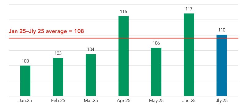 Using the new starting point, July 2025 volume dipped from June heights but remains the second highest volume month of the year. Using the new January 2025 index, the average volume for the past four months (112) has been above the Q1 2025 average (102).