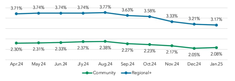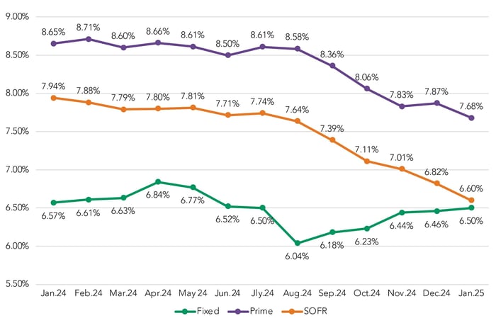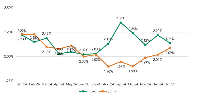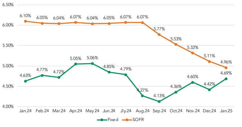 Pulling back and looking at January commercial loan pricing from a broader view, we found that the coupons for fixed-rate and SOFR-based floating loans continued to converge – a trend that began when rates were cut in Q3 2024. The gap of 160 bps in August 2024 is now down to just 10 in January.