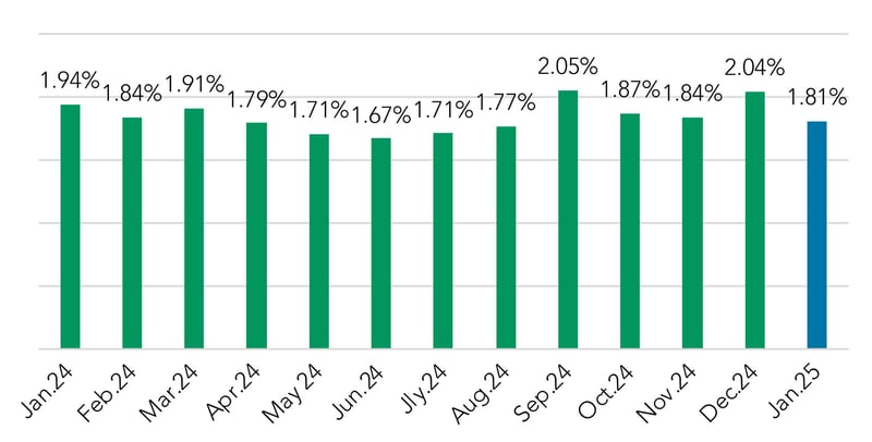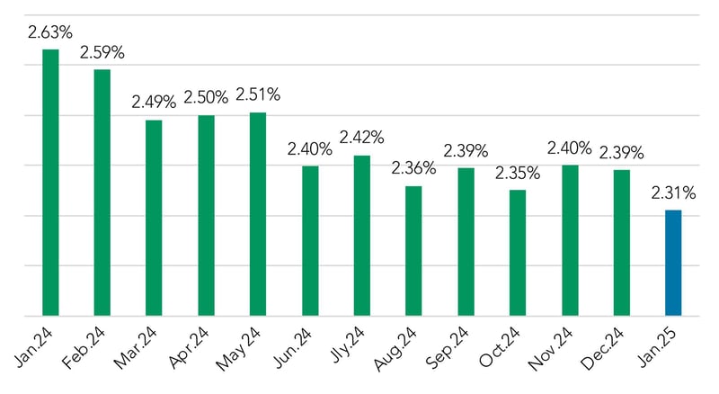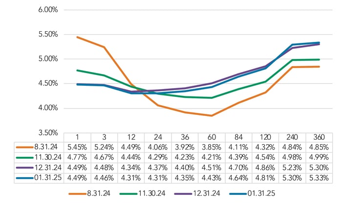 From August 2024 through January 2025, SOFR-based funding costs have fallen 101 bps – tracking the fed rate cuts of 100 bps – and the FHLB 1-month rate movement was virtually the same, down 96 bps from the Aug. 30, 2024, snapshot to the January 2025 snapshot.