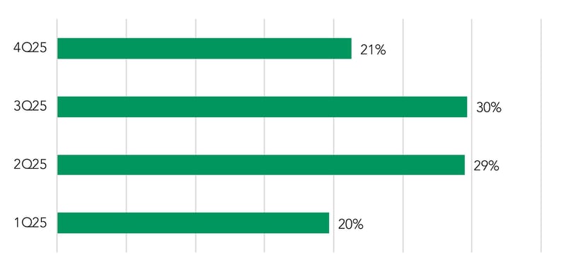 Meanwhile, fixed-rate spreads fell by 23 bps in January, down to 1.81%, the lowest mark since August 2024. Bankers do not seem to be as nimble in protecting these spreads, as evidenced by month-over-month movements of +/- 25 bps while SOFR spreads have been moving inside of 10 bps and often 5 bps.