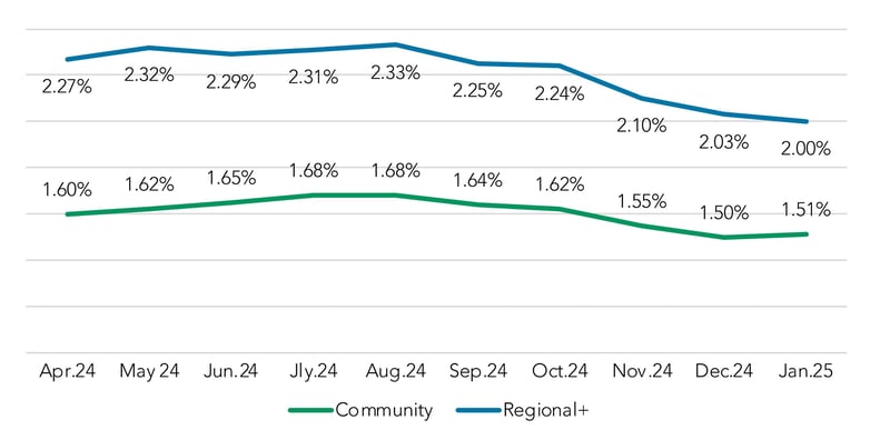 • We define Regional+ as institutions with $8B+ in assets, while Community are <$8B.