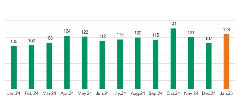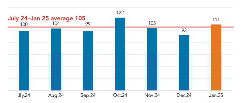 As expected, pricing volume bumped back up in January after the typical end of year drop. It’s worth noting that the January volume was not just above November/December levels but was also the second highest monthly mark since the start of 2024.