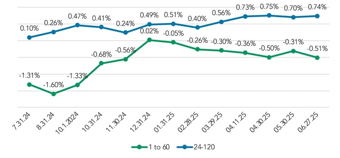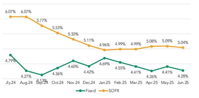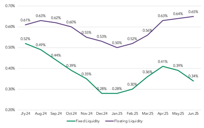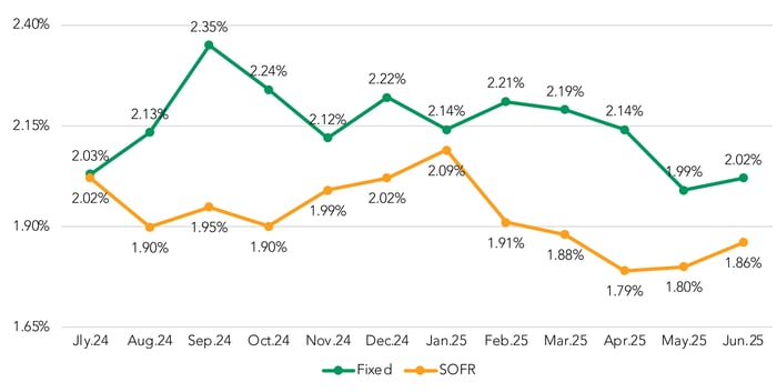 From July 2024 to June 2025, floating-rate premiums have risen 4 bps (from 0.61 to 0.65%) while fixed-rate premiums have dropped 18 bps during that same period (0.52 to 0.34%).