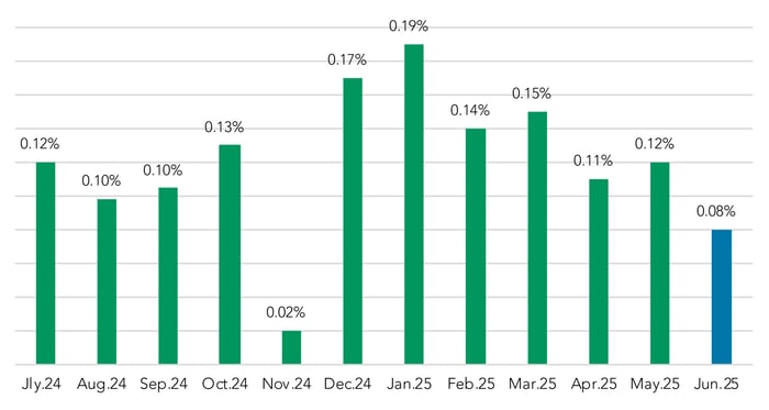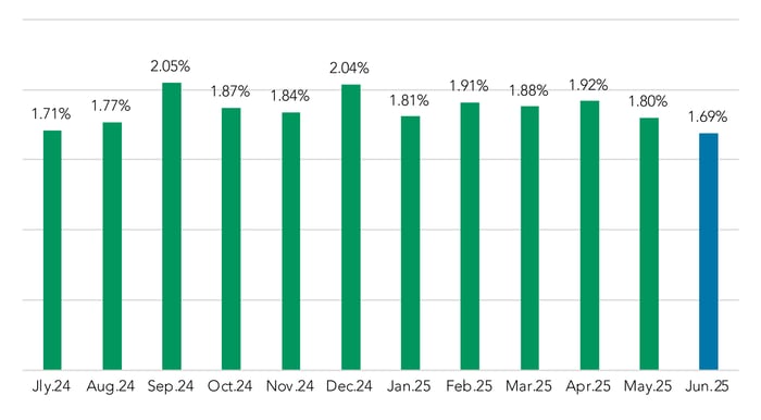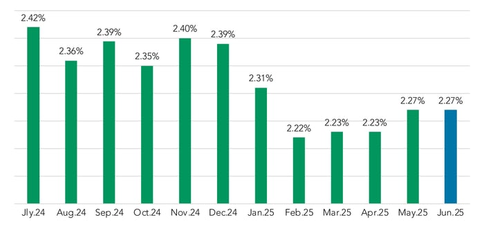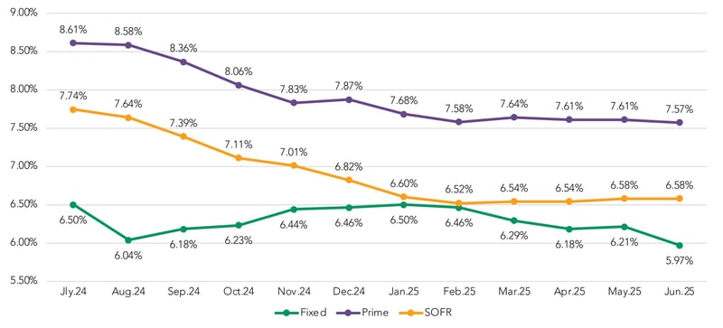 Spreads to SOFR remained steady in June, at 2.27%, while spreads to Prime dropped by 4 bps, down to 0.08%. Both are down in 2025, as compared to their Q4 2024 levels.