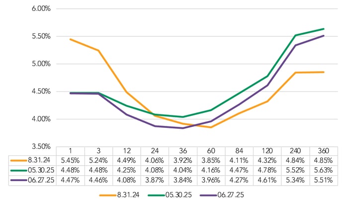 The June 27 snapshot of the FHLB Curve showed a deepening of the trough in the 12-36 month range, dropping ~20 bps below the May 30 snapshot.