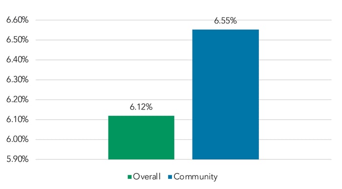 Looking specifically at fixed-rate loans, we note also that the community coupon is on average 43 bps higher than the overall market for this metric (6.55% to 6.21%).