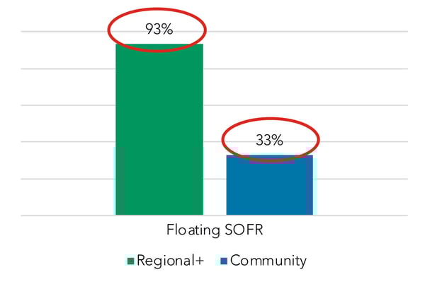 We were also struck by the gap between the community and regional+ segments when noting the percentage of institutions that participate in SOFR-based floating-rate loans. Just 33% of community institutions do so, vs. 93% of the regional+ segment.