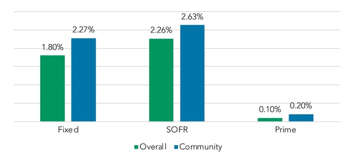 Finally, we looked at spread performance by segment. We noted that the pricing story seems considerably more positive here from the community perspective. These institutions outperformed the overall market in spread for all three major rate types, from fixed (2.27% to 1.80%) to SOFR (2.63% to 2.27%) and Prime (0.20% to 0.10%)