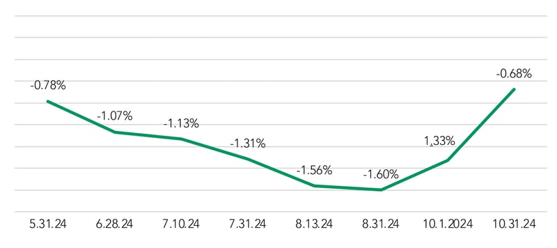 In the aftermath of the September Fed rate cut, market rates went the opposite direction, for 12-month terms and beyond. The 60-month rate rose 54 bps from Oct. 1 to Oct. 31.