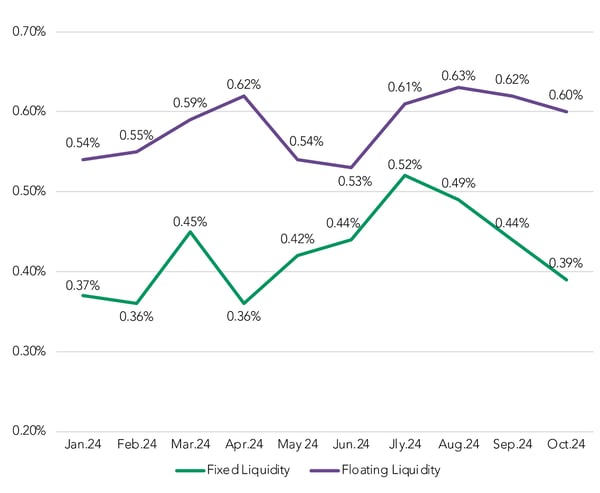 As the market rates have risen, banker liquidity adjustments have dropped accordingly for fixed-rate loans. October marked the third straight month-over-month drop, down 13 bps since July. Liquidity adjustments for floating rate loans (average maturity ~39 months) have moved in a narrow range of ~60 bps over the past four months.