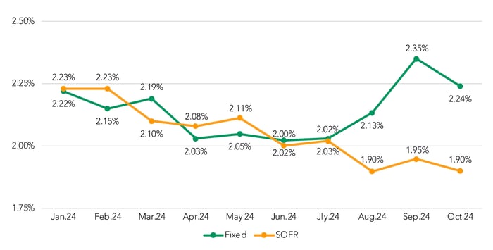 Note: We’ve received diverging feedback from bankers about which way they prefer to see fixed-rate spreads displayed. Some prefer the chart above, which expresses it in the straightforward context of fixed-rate COF. But others prefer to see fixed-rate spreads in the chart below, which uses the SOFR equivalent a comparison of different structure types. In this view, it is clear that the relative “discount” fixed-rate loans compared to SOFR structures has narrowed since August.