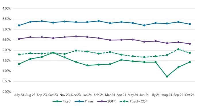 Meanwhile, static floating rate spreads meant that floating rate coupons essentially mirrored funding costs, dropping ~50 bps from August to October for both Prime- and SOFR-based structures.