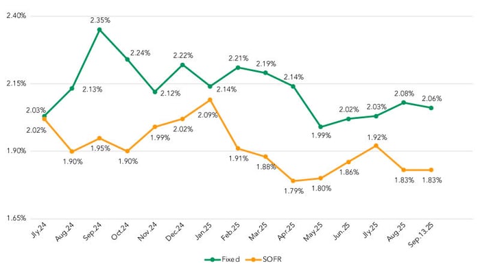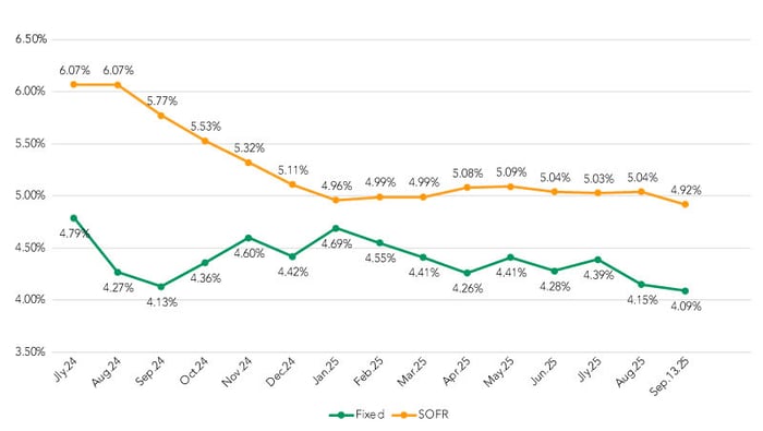 SOFR funding costs mirrored the FHLB curve, moving down by 12 bps in September, to 4.92%. Meanwhile, fixed-rate funding costs have dropped 30 bps (4.39% to 4.09%) since July.