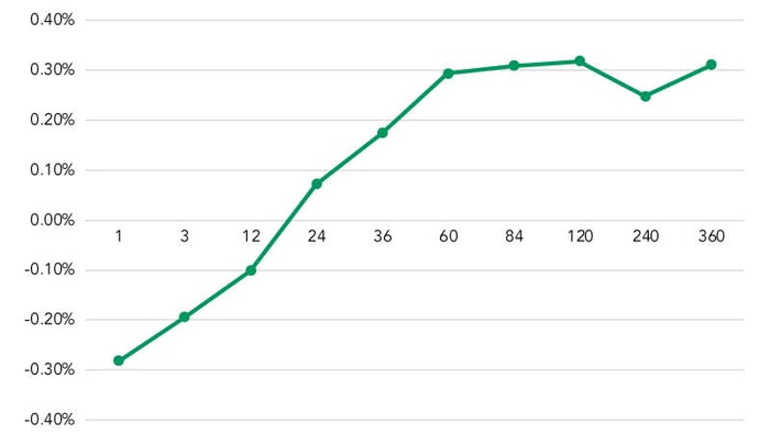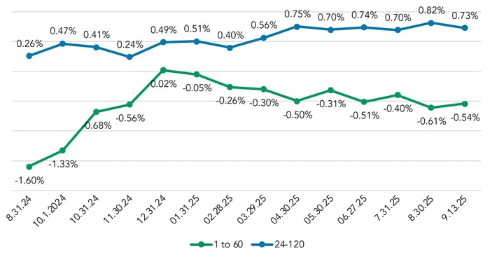 Turning back to the potential significance of the near parallel 15-20 bps drop from the end of August to mid-September, we noted that this overall shift differs from what we saw in the time period around the previous Fed rate cut, in December 2024. From the Nov. 30 snapshot before the cut to the Dec. 31 snapshot in its aftermath, short-term rates dropped, while tenors beyond 12 months increased. Meanwhile, 1-month rates had been virtually unchanged all year, until now.