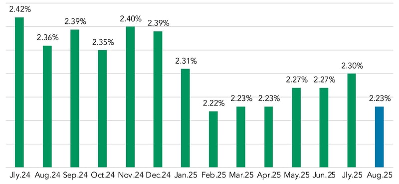 Since the Aug. 30 snapshot we also saw the first movement of the 1-month rate in 2025, as it dropped from 4.47% down to 4.31%. This could be an indication that floating rate coupons may be moving lower as well.