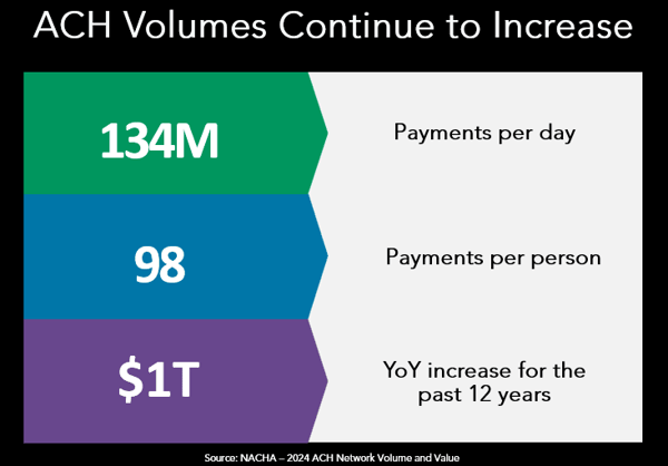 According to NACHA, the ACH network is now moving 134 million payments a day, with year-over-year growth topping $1 trillion for the past 12 years.